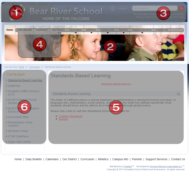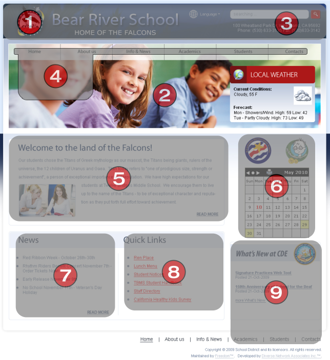- Dynamic content area - calendar, quick links, weather, RSS feeds, newsletter sign up