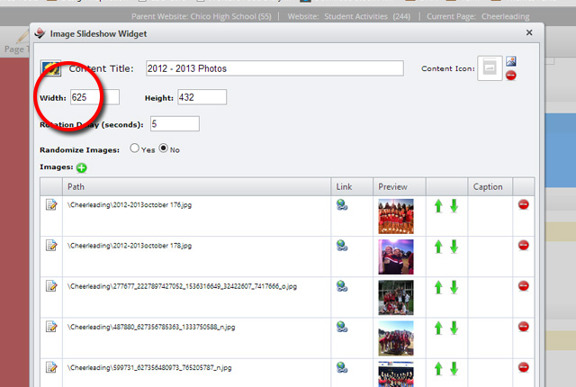 Double click the image slideshow widget card in the Catapult editor. Lowering the width to 625 or less will quickly resolve this. If necessary you can also lower the height as well when doing this (but there is generally no need).